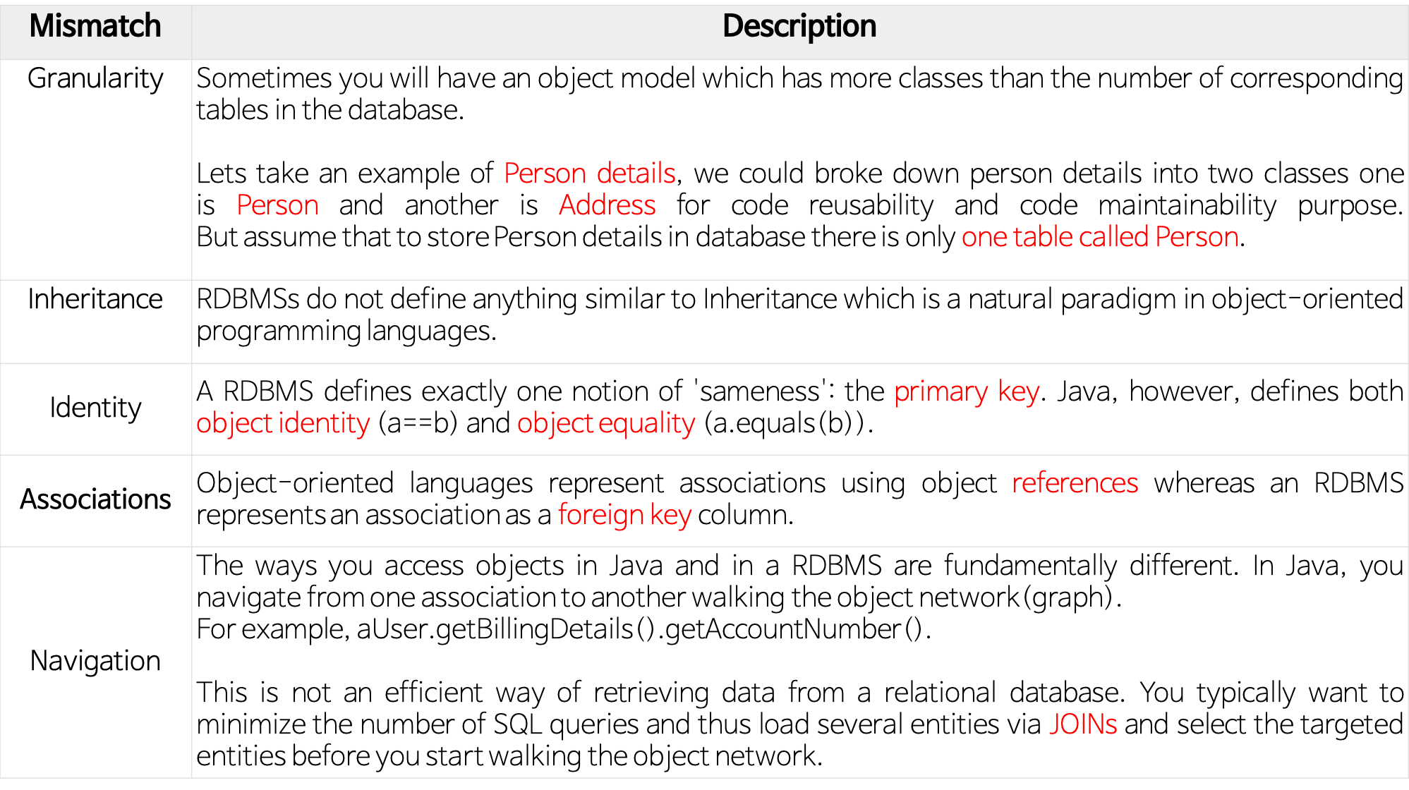 ๊ฐ์ฒด ๋ชจ๋ธ๊ณผ ๊ด๊ณํ ๋ชจ๋ธ ๊ฐ์ ๋ถ์ผ์น(๊ฐ์ฒด ์ํผ๋์ค ๋ถ์กฐํ) ๋ฌธ์ ๊ฐ ์กด์ฌํฉ๋๋ค.