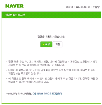 ๊ทธ๋ ๊ธฐ ๋๋ฌธ์ OAuth์ธ์ฆ์ ์งํํ ๋ ์๋น์ค ์ ๊ณต์๋ ๋ค์๊ณผ ๊ฐ์ด '์ 3์๊ฐ ์ด๋ค ์ ๋ณด๋ ์๋น์ค์ ์ฌ์ฉ์์ ๊ถํ์ผ๋ก ์ ๊ทผํ๋ ค ํ๋๋ฐ ํ์ฉ ํ๊ฒ ๋?'๋ผ๋ ์๋ด ๋ฉ์์ง์ ๋์ ํ์ด์ง๊ฐ ํ์ํฉ๋๋ค.